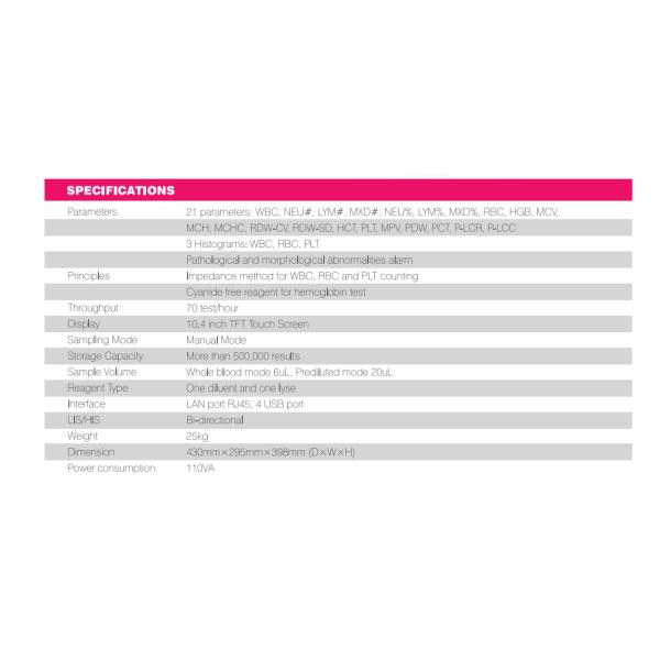 Parameter | 3-diff of white blood cell, test of 21 parameters, 3 histograms, prompt and alarm functions in case of pathological and morphological abnormalities. |